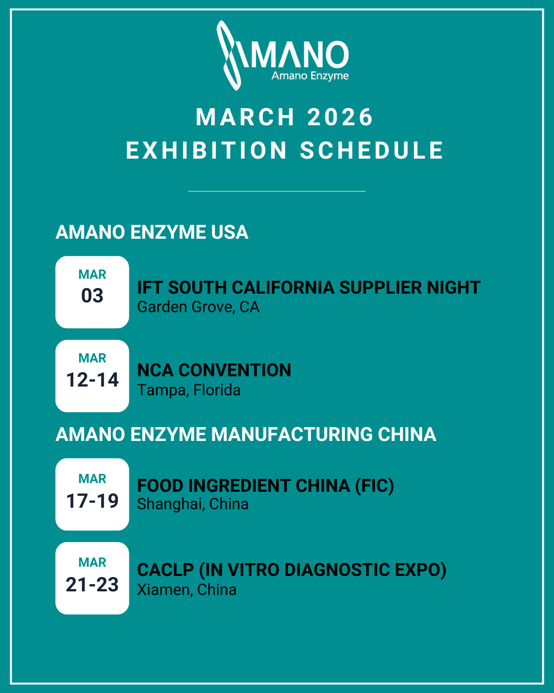 Amano Enzyme will participate in several industry exhibitions and scientific meetings worldwide in March 2026. These events provide opportunities to connect with partners, researchers, and industry professionals while sharing the latest developments in enzyme technology and biotechnology.